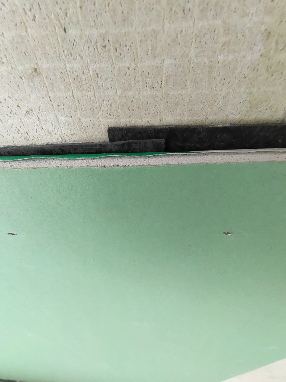 15、隔音毡超出石膏板上顶之后会有卷边,这样就能确定隔音毡铺到位了。