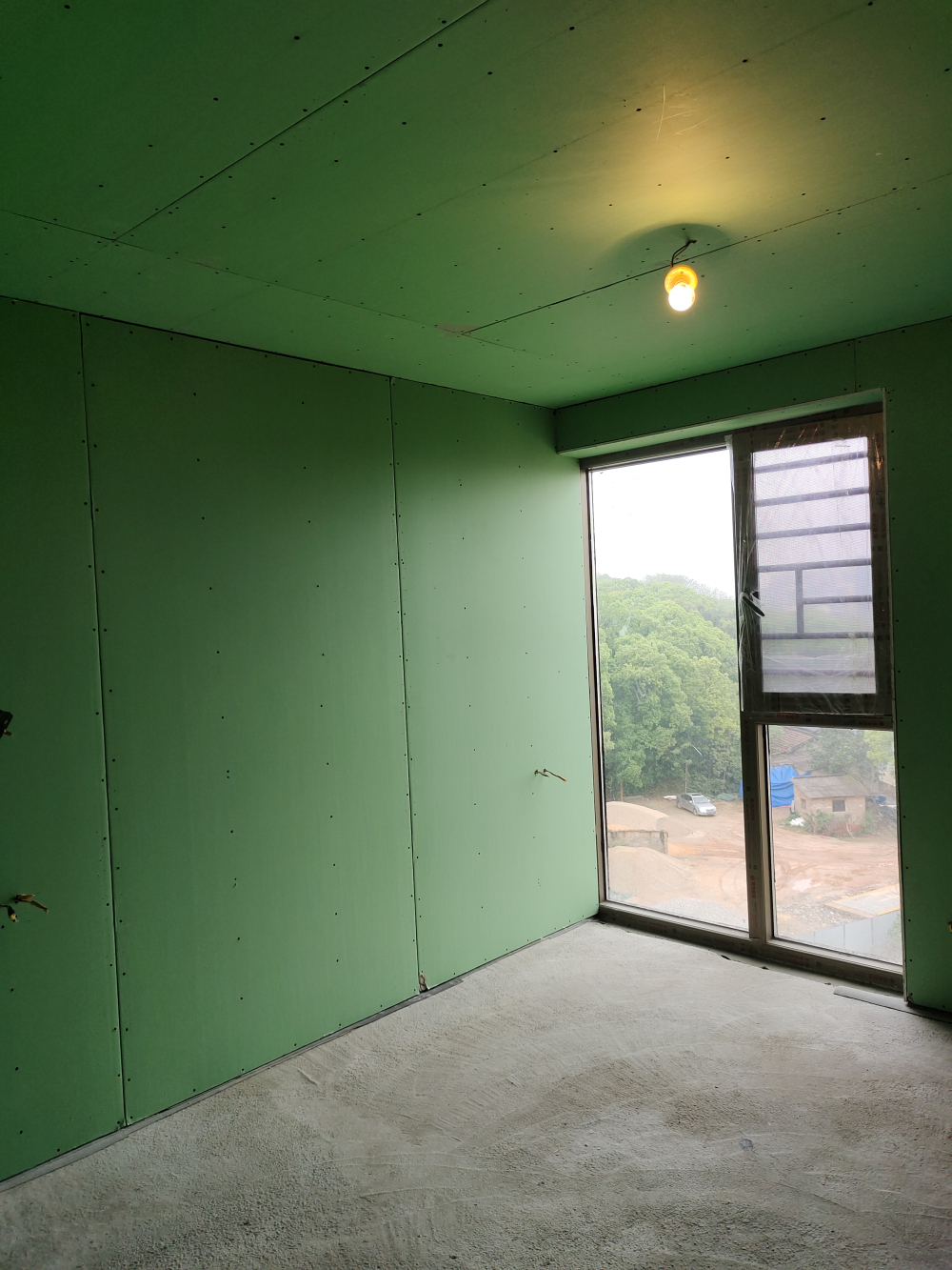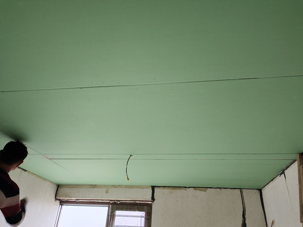 19、铺装石膏板,选用的泰山牌防水石膏板。完成后室内一下变成绿色很舒服。