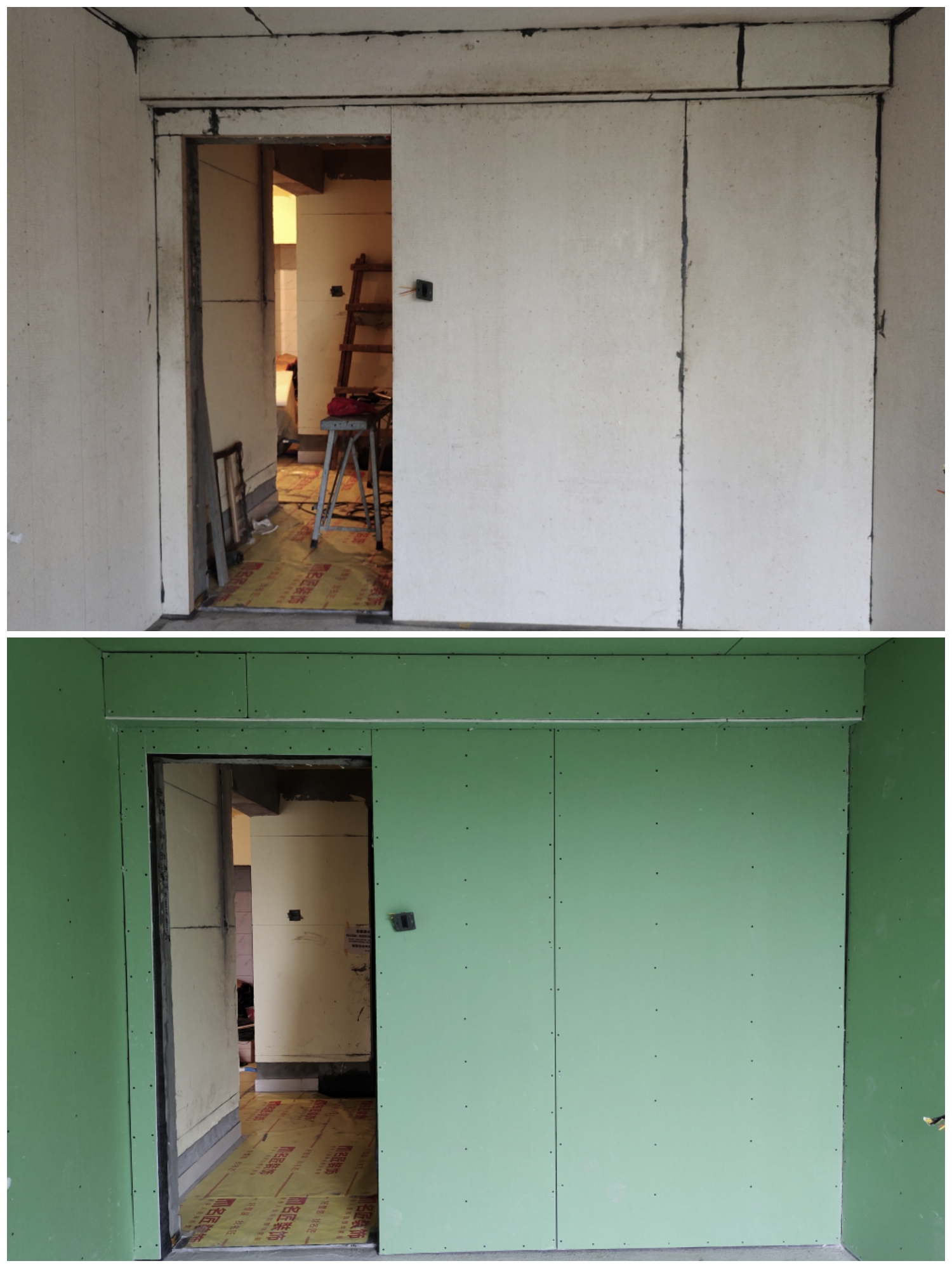 8. 门洞底部返边上墙,隔音毡比较薄,不会影响安装房门。