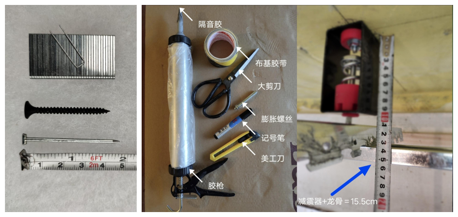 小工具:高粘布基胶带,一把合手的大剪刀,10个的膨胀螺丝,水性记号笔,木工用美工刀,还有就是大家最关心的厚度,可以将吊顶厚度控制在18公分多一点。