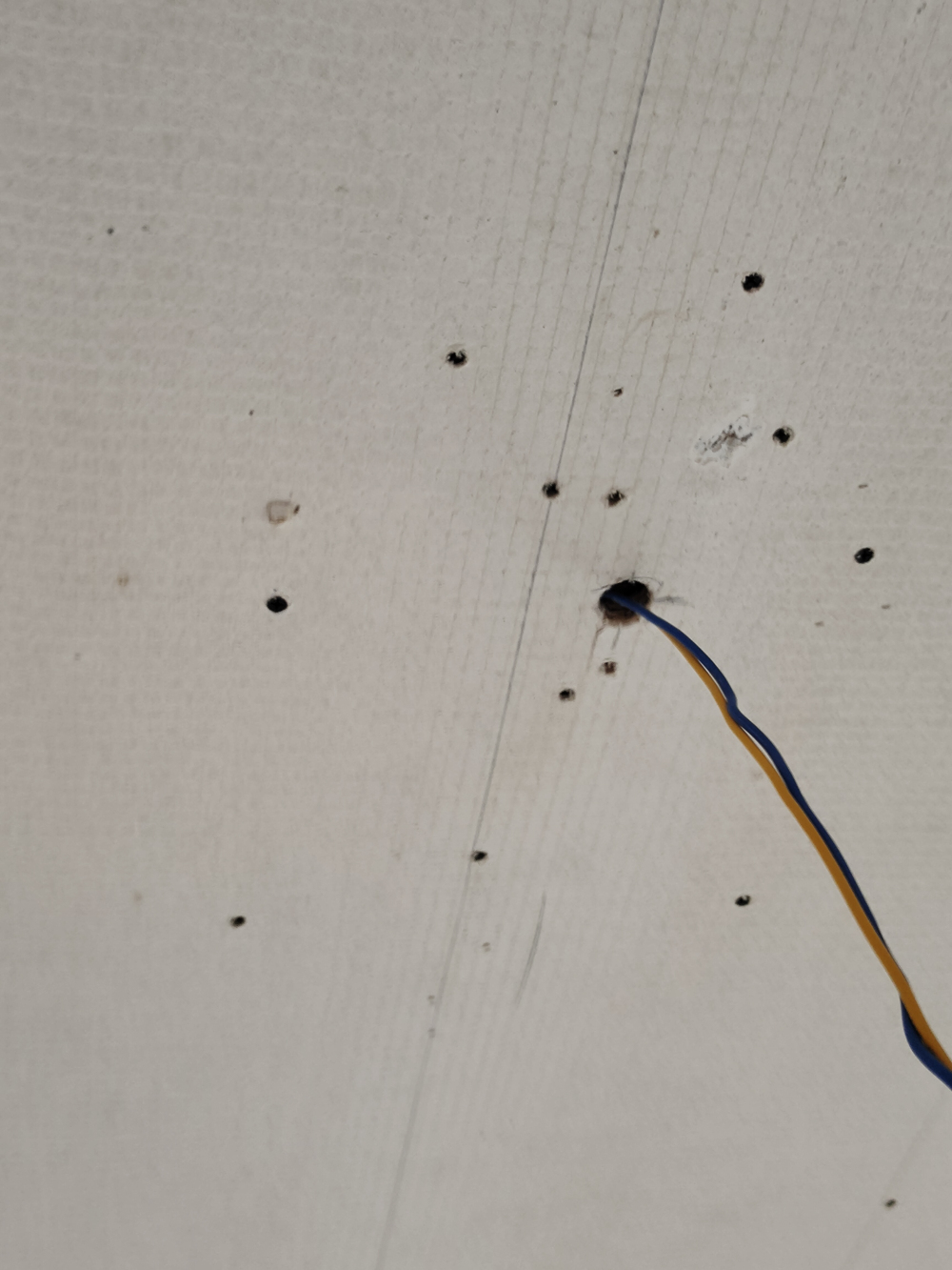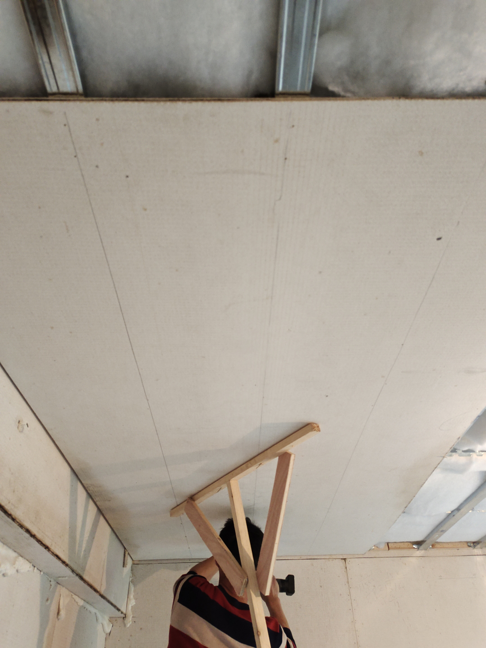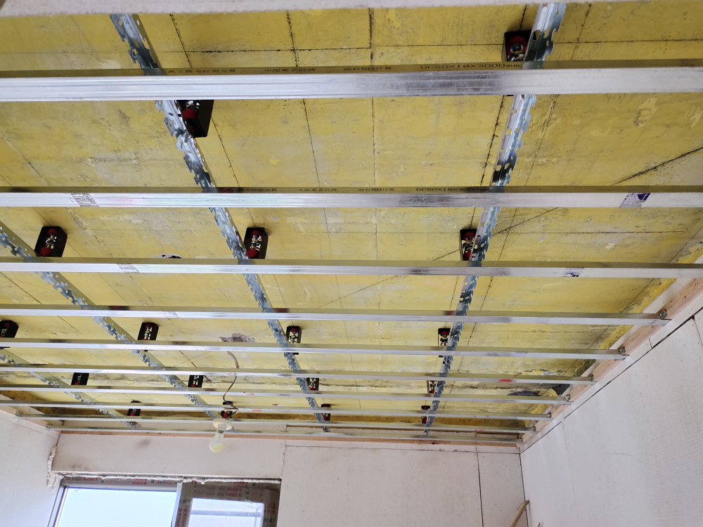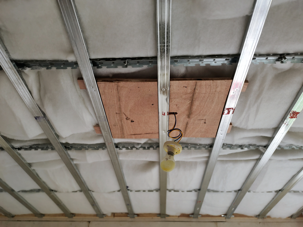 12、隔音毡上顶,这才是最难搞一步,隔音毡很重而石膏板又脆容易折断,安装时需要很小心。毡+板同时上顶的好处是免去了用万能胶固定隔音毡,胶水不环保,家装少用为好。