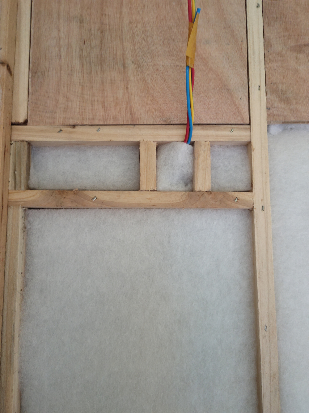 7、空调挂机位置大芯板打底加固。后期选择明装超薄型空调插座,所以不要底盒,能避免产生声学孔洞。