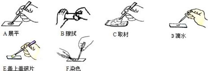 动物细胞:擦、滴(生理盐水)、刮、涂、盖、染、吸。