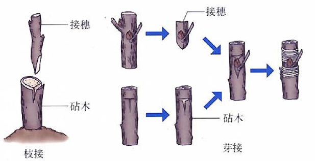 苹果、梨、桃等很多果树都是利用嫁接来繁育优良品种;(嫁接时应当使接穗与砧木的形成层紧密结合)。
