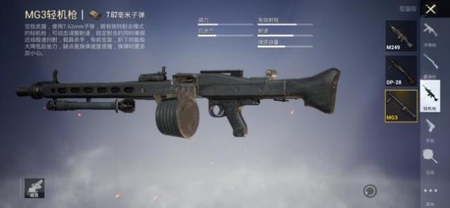 新版本自然会有新的装备,MG3轻机枪,配备7.62mm子弹,弹容75发,配件目前出了弹瞄。值得一提的是,它具备660普通射击外,还具适应近战时的990急速射击,急速射击下MG3轻机枪可被以动态调整射击速度。MG3轻机枪有前支架,趴下时能在很大程度上降低后坐力,但缺点是换弹速度较慢,换弹时需要小心一些!