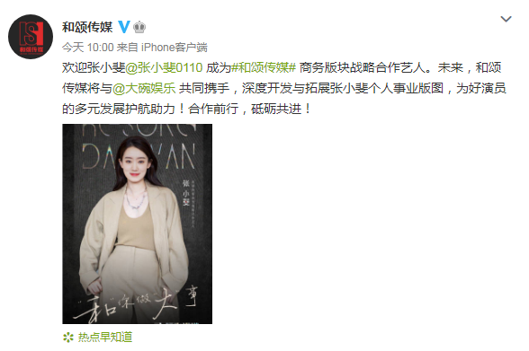 鞭牛士 4月12日消息,据@和颂传媒官方微博发文称:欢迎张小斐成为和颂传媒商务版块战略合作艺人。未来和颂传媒将与大碗娱乐共同携手,深度开发与拓展张小斐个人事业版图等。