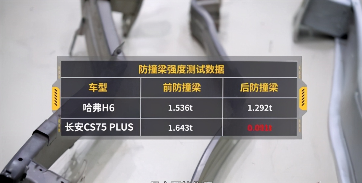 同时,在后防撞梁的压力测试中,CS75 Plus仅能承受91公斤的压力,成年人都能轻松踩弯。作为对比,哈弗H6的成绩是1292公斤,主流车型的成绩也均在700-1400公斤范围内,CS75 Plus作为新晋销量冠军,后防撞梁强度仅为哈弗H6的零头,怎么都说不过去吧?