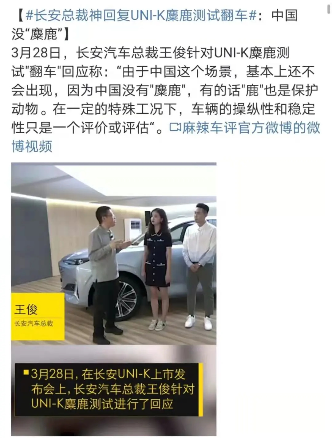 然后,在网友的口诛笔伐下,UNI-K依然选择推迟5天,在3月28日正式上市,长安汽车总裁王俊主动回应UNI-K的麋鹿测试事件,称麋鹿测试的场景在中国基本不会出现,因为中国没有麋鹿,有也是保护动物。