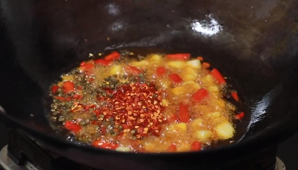 4、锅中留少量的底油,油热后下入切好的小米椒、蒜粒以及姜片,开小火不断翻炒爆出香味,炒出香味后加入一勺郫县豆瓣酱,继续开小火不断翻炒,炒出红油后下入一小撮青花椒以及辣椒面,继续开小火不断翻炒出香味;