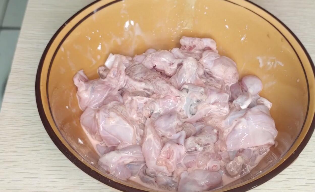 2、先将牛蛙腌制一下,加入适量盐、料酒,抓拌均匀后腌制20分钟入味,20分钟后,撒上适量干淀粉,抓拌均匀,使牛蛙表面均匀地裹上一层薄薄的淀粉,放置一旁备用;