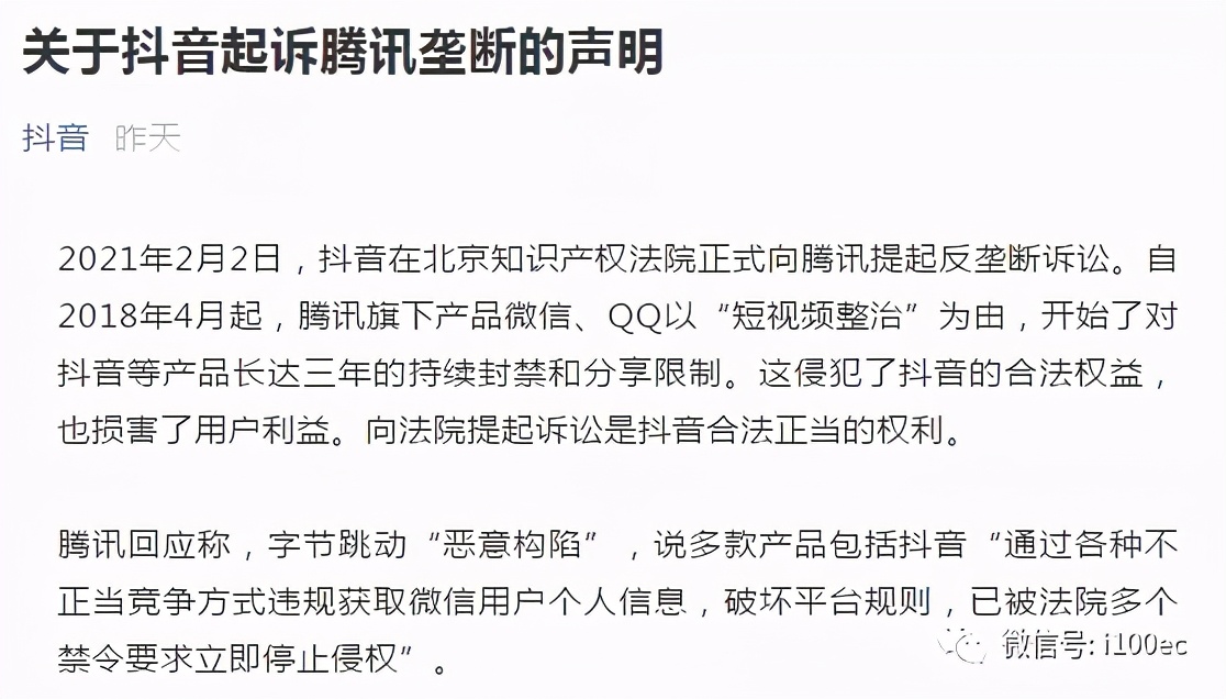 2月2日,抖音向北京知识产权法院正式提交诉状,起诉腾讯垄断。抖音方面认为腾讯通过微信和QQ限制用户分享来自抖音的内容,构成了《反垄断法》所禁止的“滥用市场支配地位,排除、限制竞争的垄断行为”。抖音要求法院判令腾讯立即停止这一行为,刊登公开声明消除不良影响,并赔偿抖音经济损失及合理费用9000万元。不过,3月29日,根据福州中院民事裁定书,抖音对腾讯诉讼案已撤诉。