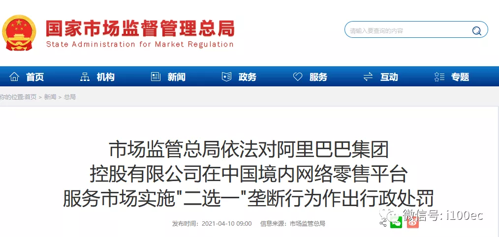 4月10日,国家市场监管总局发布对阿里巴巴集团控股有限公司在中国境内网络零售平台服务市场实施"二选一"垄断行为的行政处罚,责令阿里巴巴集团停止违法行为,并处以其2019年中国境内销售额4557.12亿元4%的罚款,计182.28亿元。