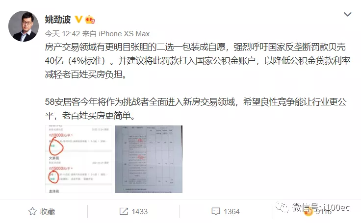 4月10日,贝壳的竞争对手,58同城CEO姚劲波发文呼吁,在房地产交易领域存在更明目张胆的“二选一”,强烈呼吁国家对贝壳进行反垄断处罚,按照4%的标准处以40亿元的罚款。