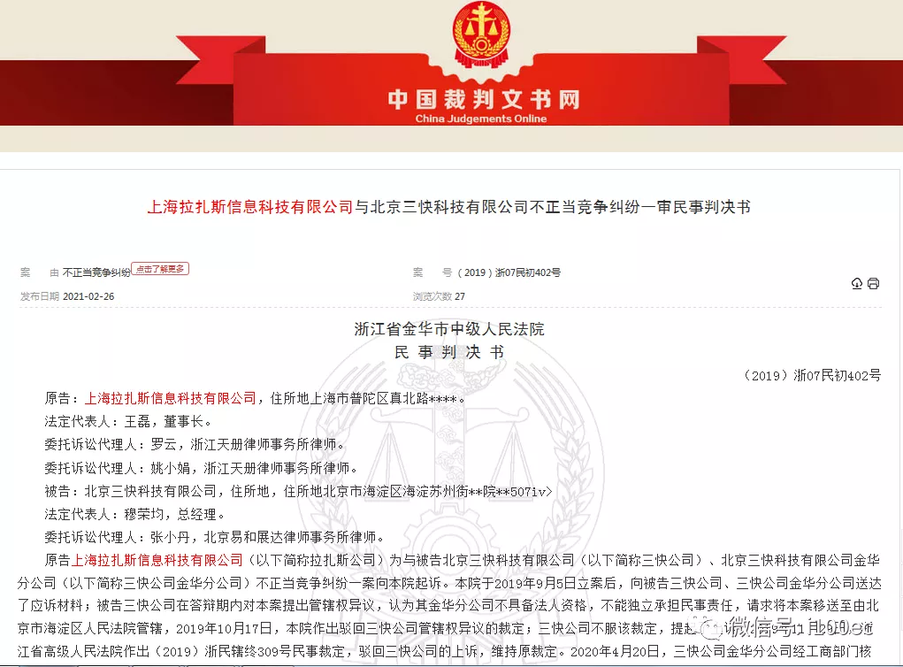 2月26日,浙江省金华市中级人民法院对此前浙江金华美团要求部分商户与其达成排他性交易的做法作出判决,北京三快科技有限公司金华分公司实施的不正当竞争行为,损害了拉扎斯公司的合法权益,应当承担民事责任。法院对上海拉扎斯信息科技有限公司(饿了么)要求北京三快科技有限公司(美团)赔偿100万元经济损失的诉请予以全额支持。(更多详见网经社【专题】美团因不正当竞争行为败诉 赔偿饿了么100万元 http://www.100ec.cn/zt/elmsj/)