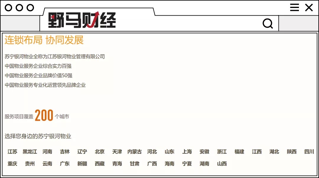银河物业目前覆盖全国超200个城市,项目包括商业综合(各地苏宁广场)、住宅和售楼处、产业园区(小镇和物流中心)、办公楼以及公共服务,在江苏省的项目数量远多于其他省份。