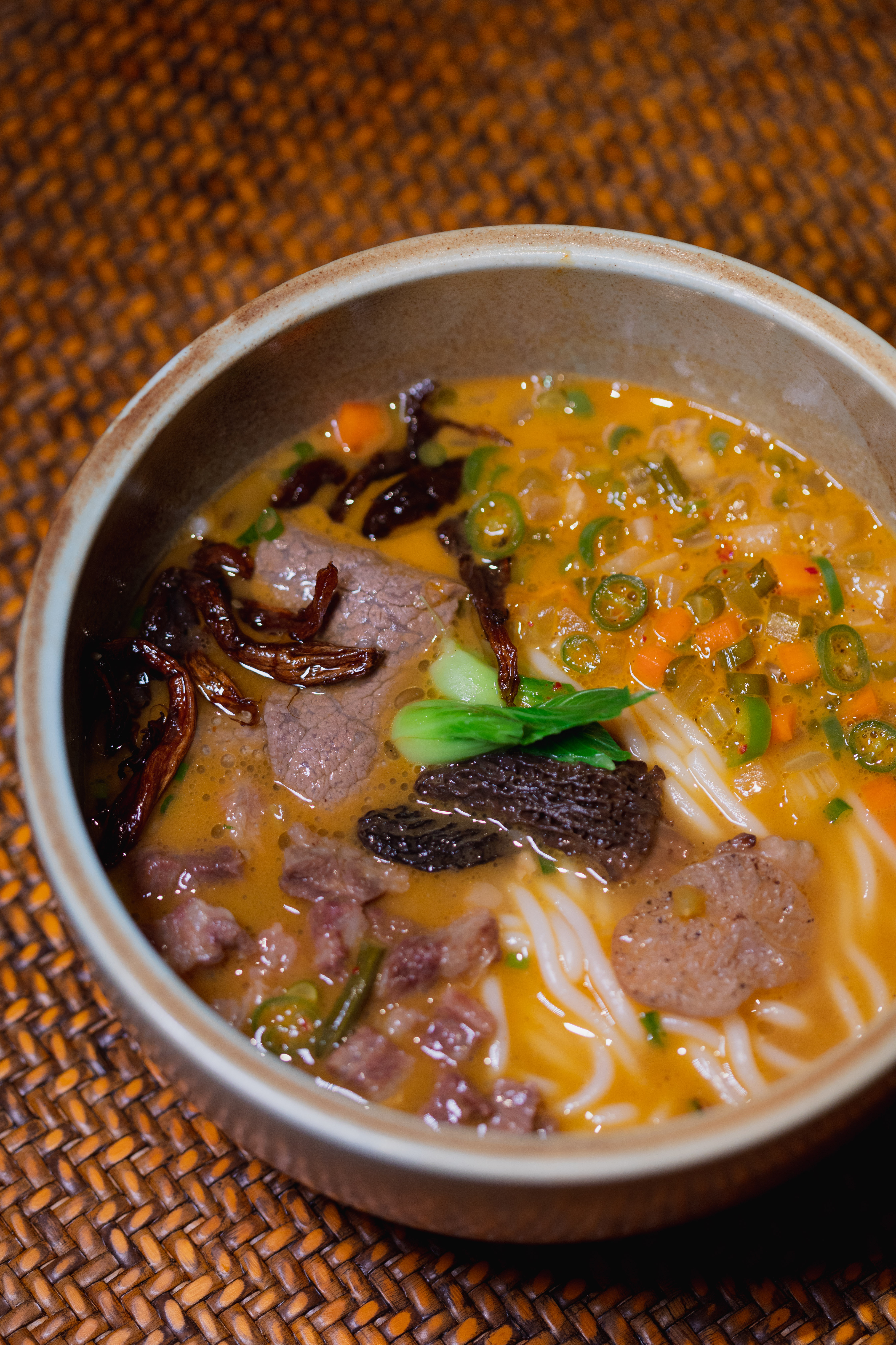 从熬制汤底开始,就注定了它的难度。牛尾牛骨汤、土鸡汤和鲫鱼汤分别熬制后,再按比例混合而成的“三汤合一”,带来了难以形容的醇厚和鲜美。羊肚菌、羊肚耳、油鸡枞的加入,这碗粉又多了一重菌子的鲜香。黑毛和牛肋条的炒码配上大块的和牛肋条,最后用付师傅独家泡菜提味。所以千万不要小看这碗米粉,这不是一碗普通的米粉,而是古代湖南“士大夫”阶层的高级粉。