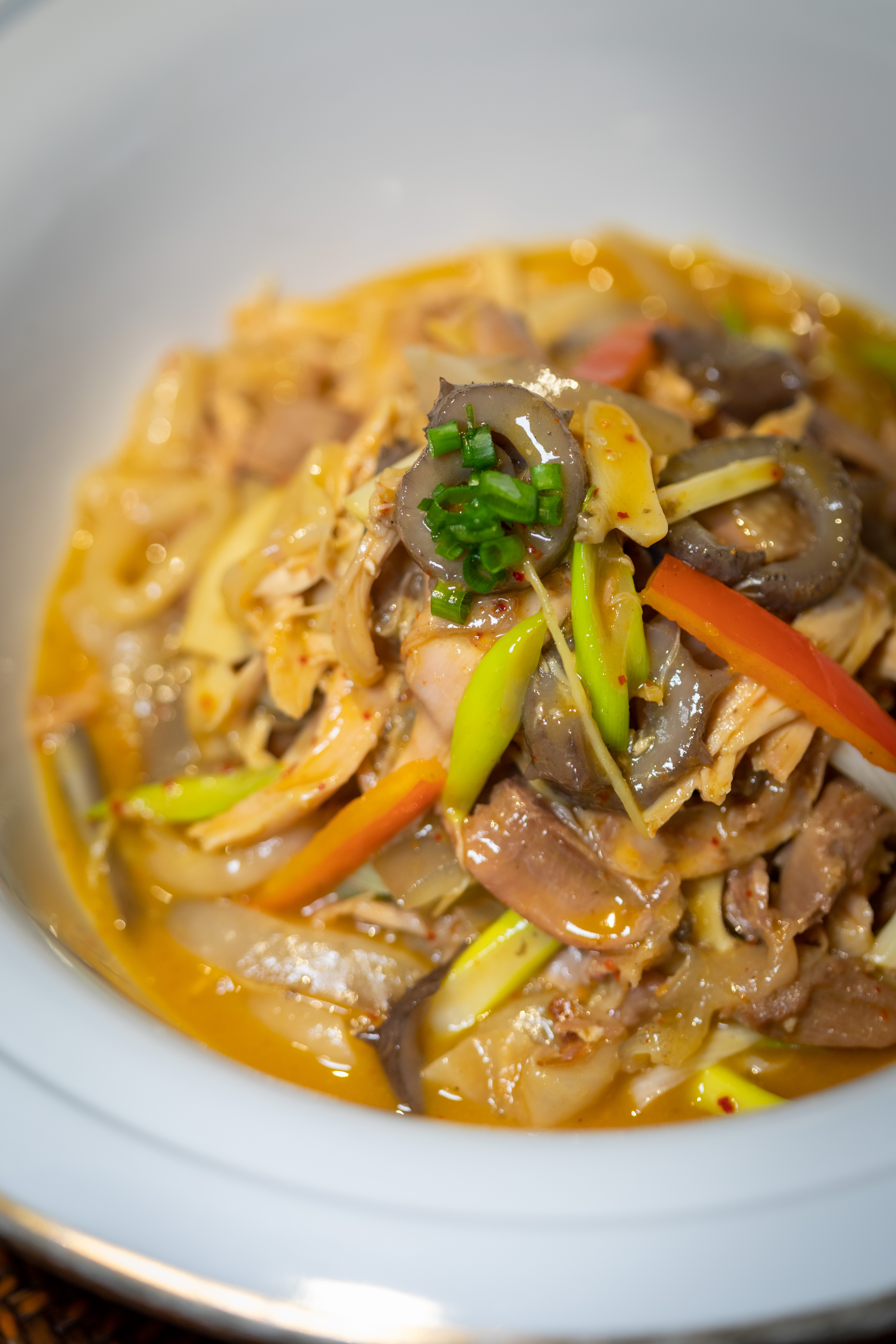 如果你以为的湘菜的招牌菜还是剁椒鱼头,那你一定算不上真的了解湘菜。在湘菜的十大名菜中,当之无愧的C位绝对非东安鸡莫属。这道菜的家常版本有个更加朴素的名字叫做“醋鸡”。因为颇受曾国藩、左宗棠等名人的青睐,后来又走上国宴,东安鸡的风头必然无出其右。在东安鸡的制作中,用醋的技巧绝对是真正考验厨师功力的重点。官府版本的东安鸡,要用去骨的土鸡小火煨炖,免去了吃到骨头的繁琐,也让食用体验变得更加优雅和愉悦。鲍鱼丝、裙边、海参等海珍的加入,无论从口感还是鲜度都有了大幅提升。把米醋、陈醋、白醋按照特定比例,分三次下入菜中,如何充分保留醋香的同时,又激发出鸡肉的香味,每个厨师都有自己不予外人道的秘密,也是保证了这道菜是否成功的最大诀窍。微麻、微辣、微酸,如果放凉了,会变得更加好吃,就这葱丝和姜丝,配面或拌饭都是一绝。