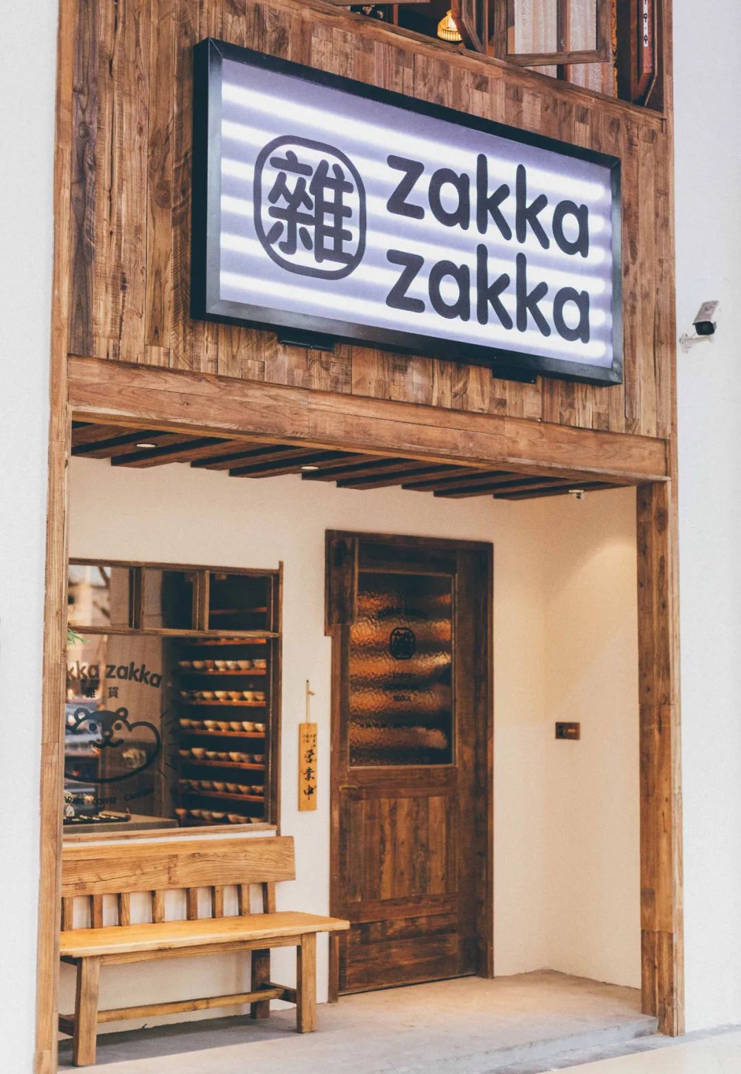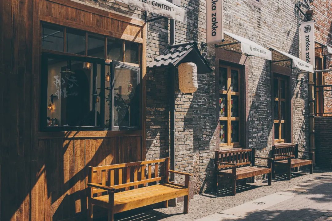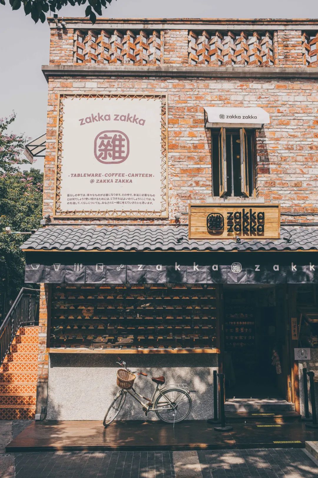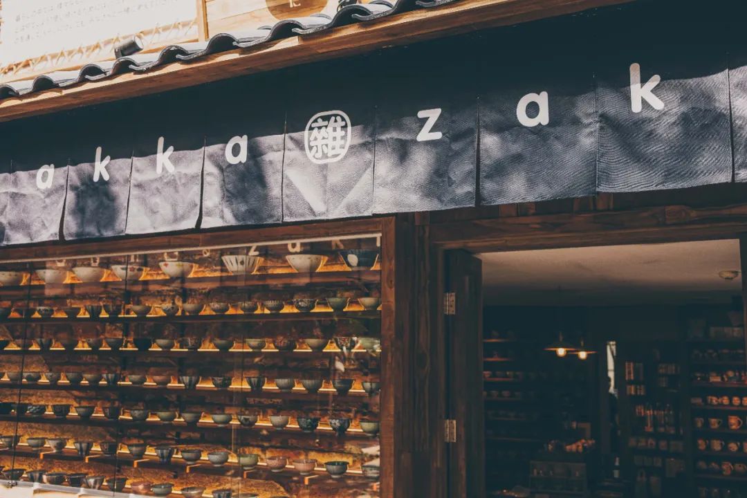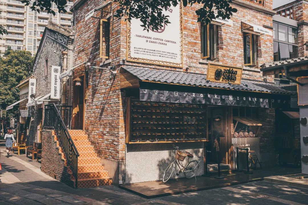 「zakka zakka 日料雜貨」岭南天地店得益于找到了一幢百年建筑,于是团队决定将日式乡村风格与岭南建筑结合一起。所以看到的砖瓦楼房下,挂着日式的帷幕灯笼。仿佛穿越到了京都,但又好像不是。