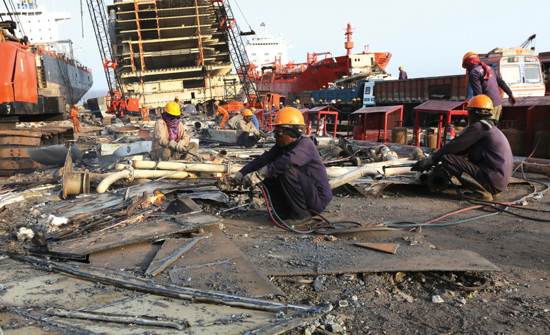 像自然界里一个动物或者昆虫死亡后会有蚁群蜂拥而上把它们分解,在阿朗每天也上演着相似的一幕。每天清晨,成千上万的工人们扛着气焊切割机等简单的工具爬到船上,一点点的把这些昔日的海上巨人拆解。