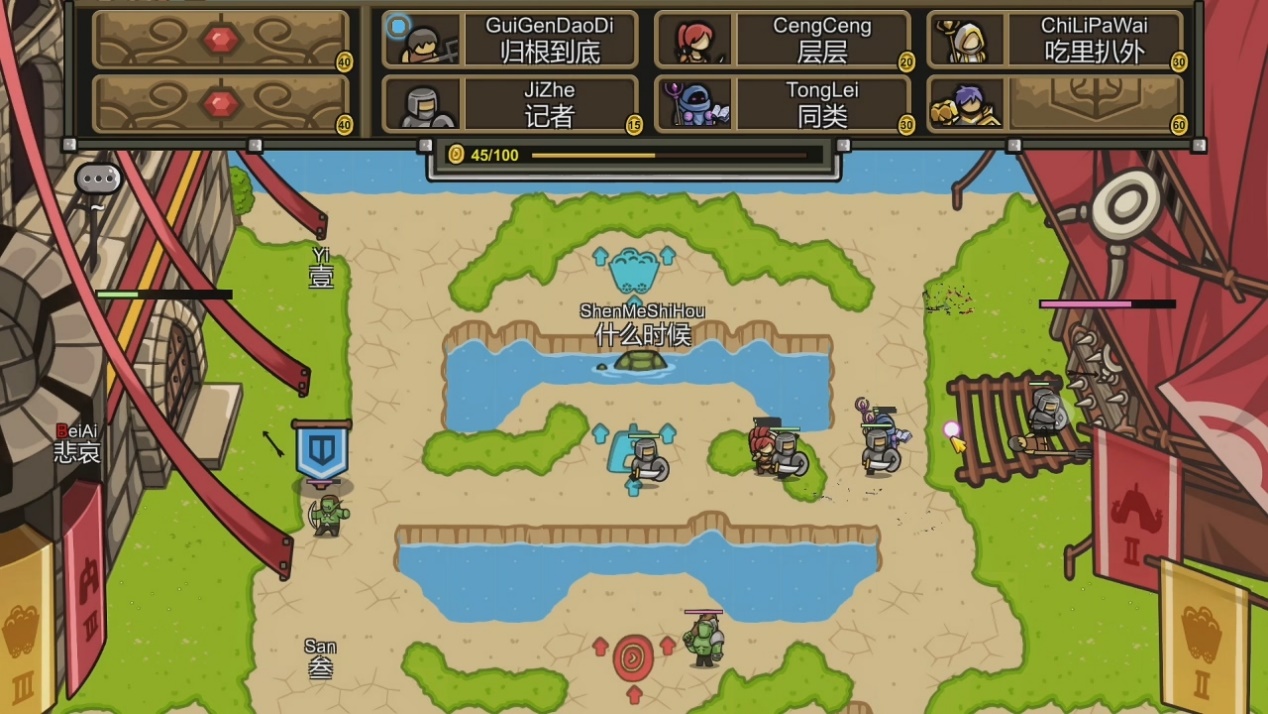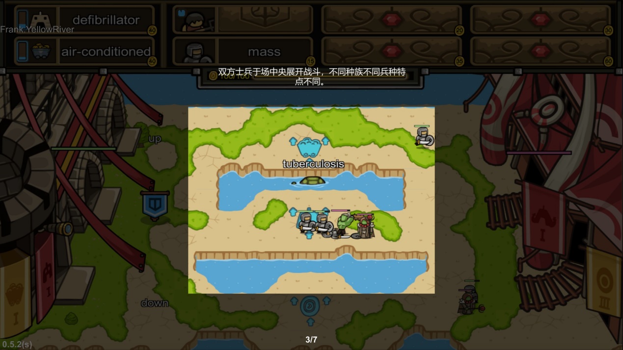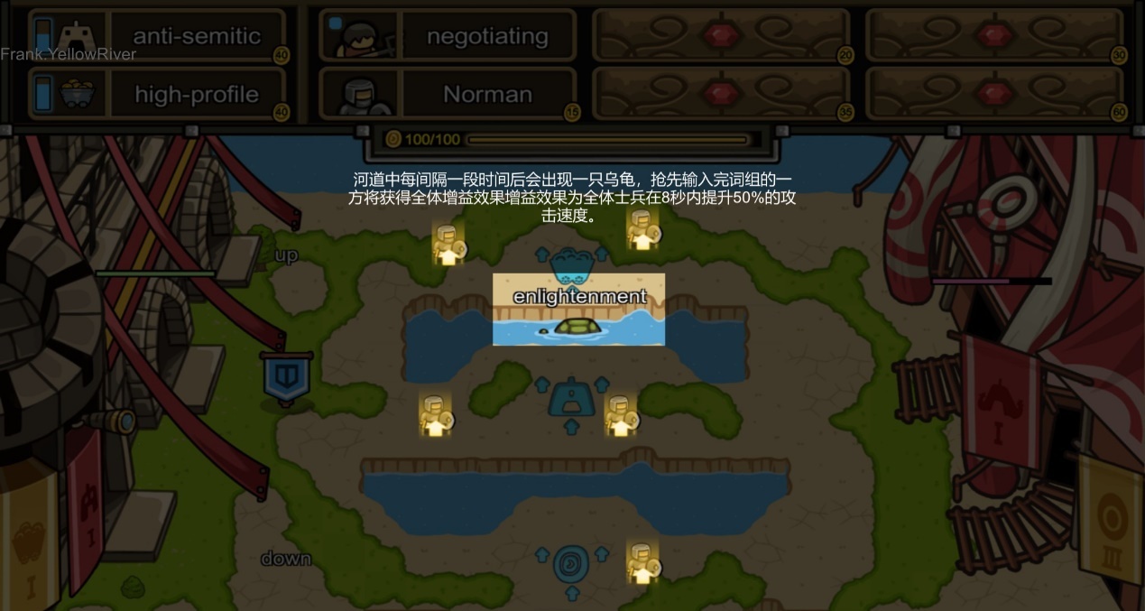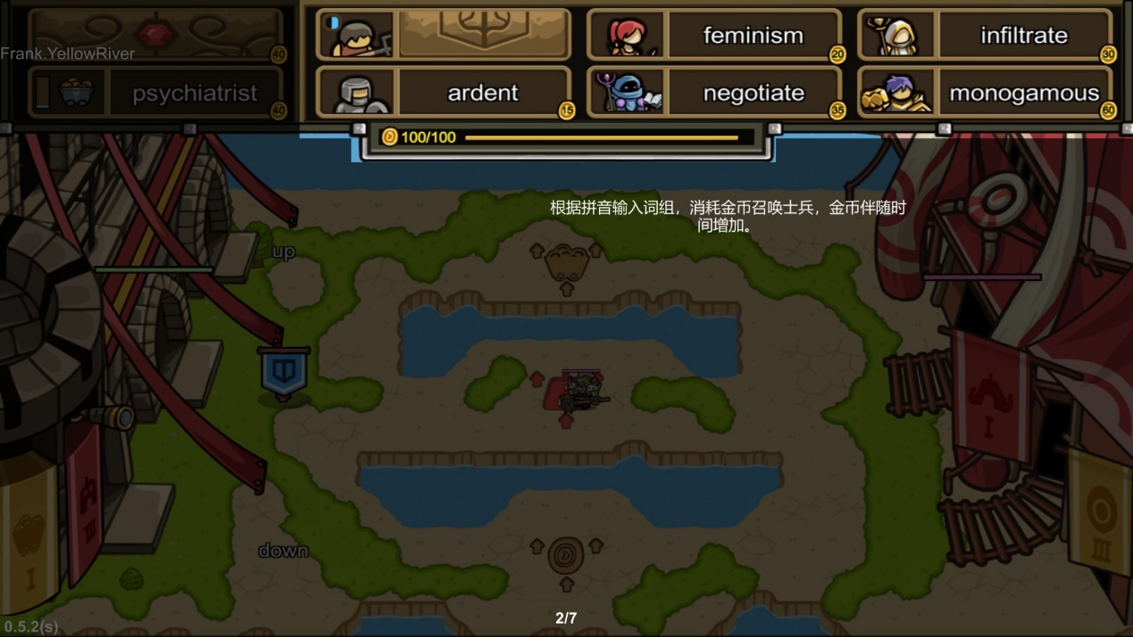 当然,最重要的一点来了,以上所有的游戏元素,从资源升级到基地升级,从选择出兵/防守路,再到选择出兵兵种,最后再到基地的箭塔防守动作,全部依赖一个操作——打字,看屏幕上相应的基地、矿山、兵种、河道生物的图标下出现的词汇和拼音,快速打出拼音,完成相应的操作。