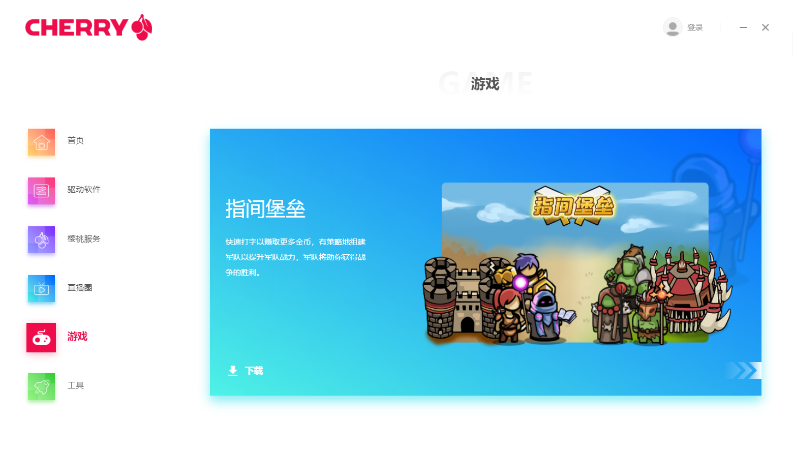 除了在STEAM上释出的EA版本,目前《指间堡垒》也在CHERRY助手上线,玩家可以在CHERRY官网 https://www.cherry.cn/software下载CHERRY助手软件,安装后可在CHERRY助手的游戏选项找到《指间堡垒》的下载页面,这感觉就更对味儿了,毕竟这是一个非常适合用来体验新键盘手感的游戏,也能够帮助用户更好上手新键盘,CHERRY机械键盘的用户下载来玩玩吧,说不定单臂强壮的老毛病就从此解决了。