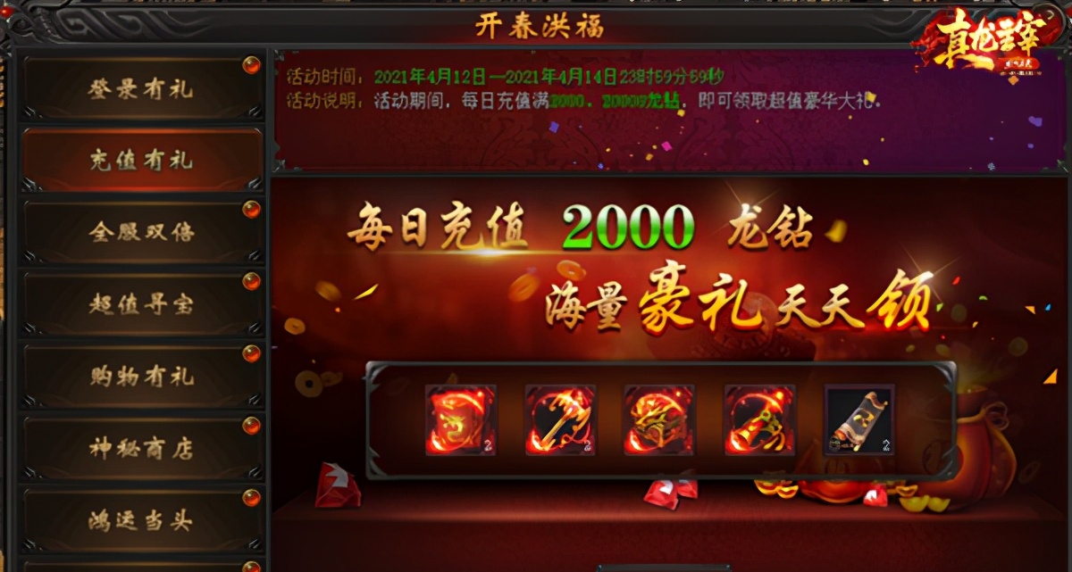 战龙春季开春洪福活动即将开始,为了让广大玩家想知道一些关于活动的内容,在此小编像大家透露一点精彩活动,大家可以踊跃参加!活动时间4月12日至14日。