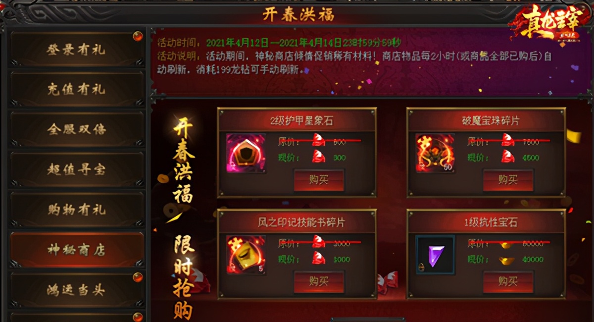 活动期间,神秘商店倾情促销稀有材料!商店物品每2小时自动刷新(或全商品全部已购后),消费199龙钻即可手动刷新。这些材料的爆率平时打BOSS是很低的几率爆出,打到手软,看到麻木都不一定出的了,但是有了这次机会就不需要大家耗费精力,时间去苦苦寻找。但是因为是自动刷新,各位兄弟可千万记得来看一看有没有需要的材料,要是被刷走了可就太亏了呀!