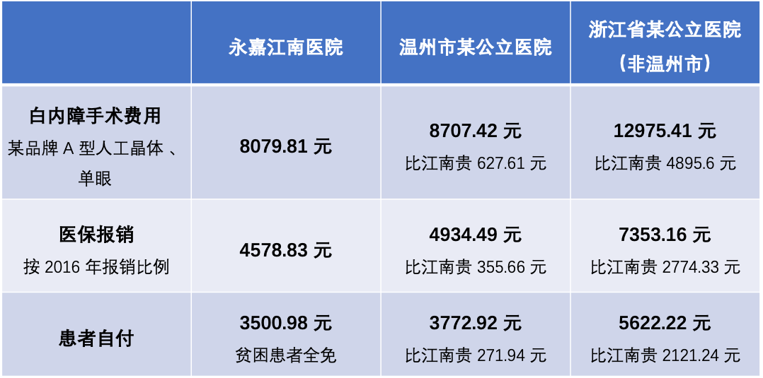 这样的定价,无论是和温州市还是和浙江省的公立医院相比,都是偏低的:不仅手术总费用要便宜 600~4800 元,医保报销的部分也比其他医院节省了 350 元以上。