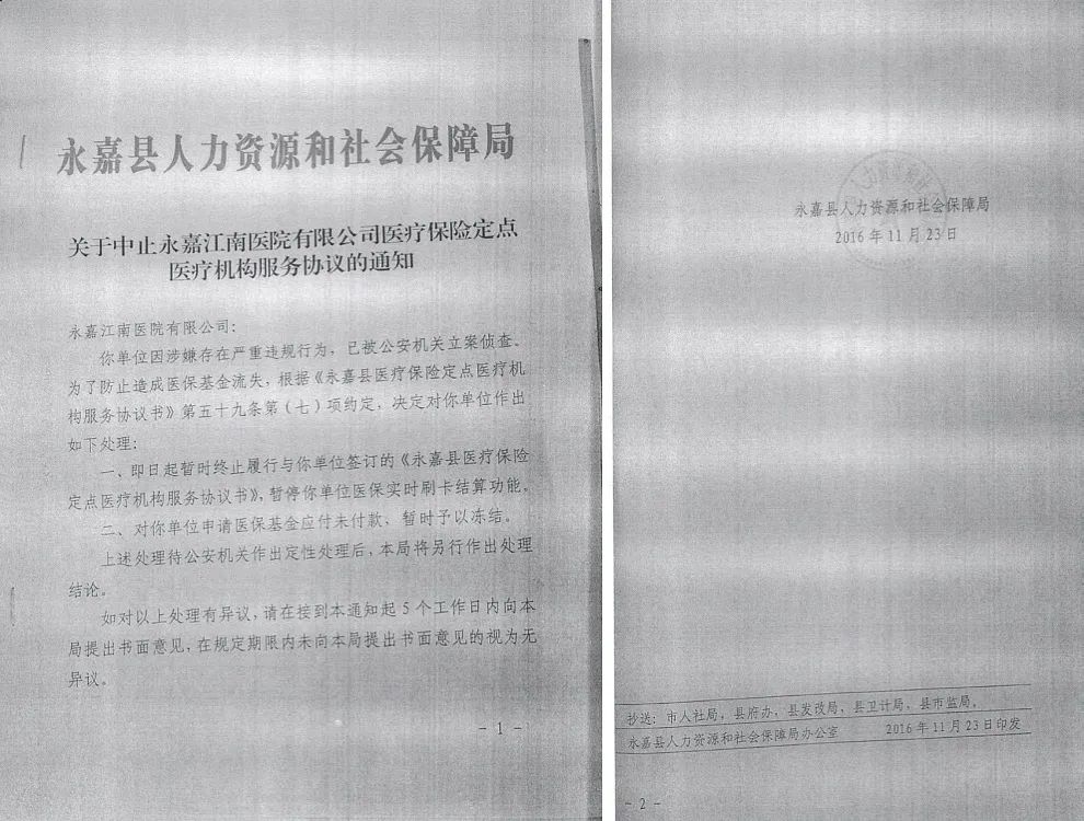 这起事件要追溯回 2016 年 11 月。当时,永嘉江南医院的 9 名股东因「涉嫌骗取医保基金」被公安机关带走调查。随后,永嘉县人力资源和社会保障局做出行政处理,冻结了应该付给永嘉江南医院的 379 万余元医保基金。