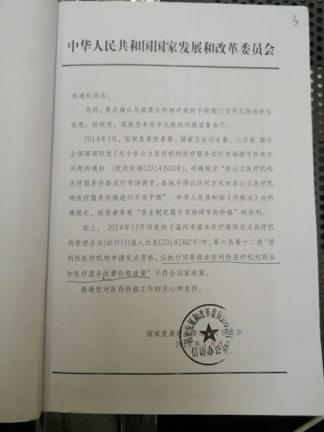 2018 年 1 月 8 日,国家发改委正式回复,表示国家明确规定「非公立医疗机构医疗服务价格实行市场调节,各地不得以任何方式对非公立医疗机构医疗服务价格进行不当干预」,因此,温人社发(2014)382 号文件中的部分条款,不符合国家政策。