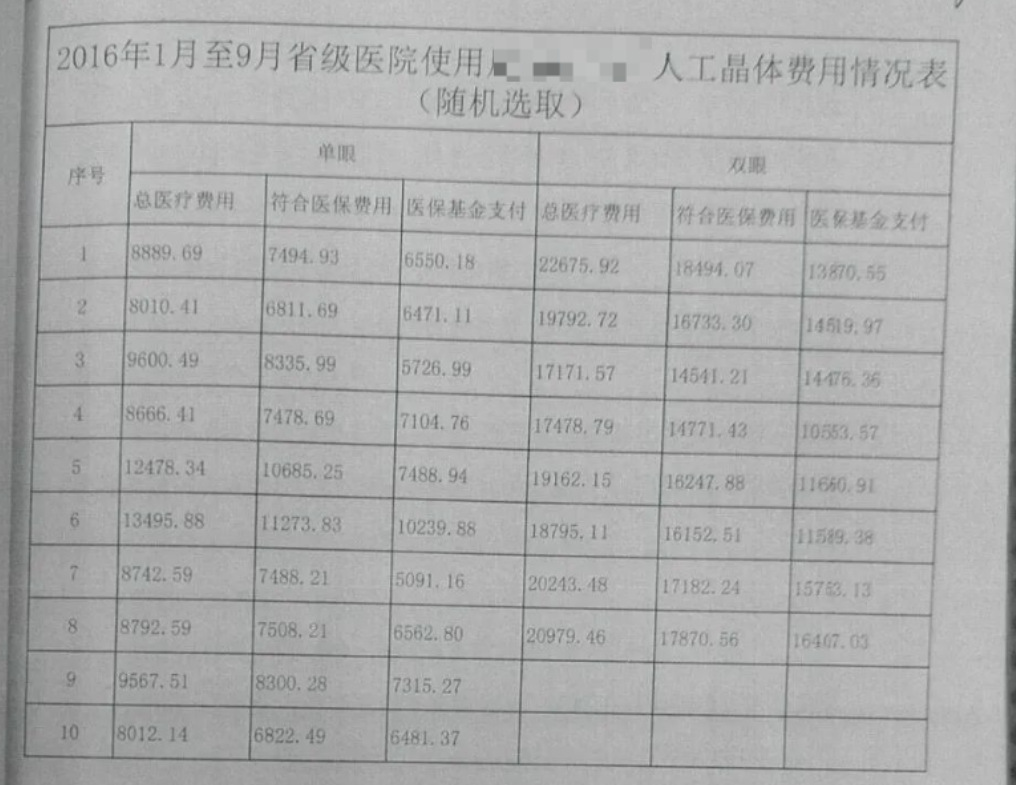 永嘉县医保局随机抽取 10 家省级医院使用某品牌 A 型人工晶体的手术费用和医保报销情况(图源:张区提供)