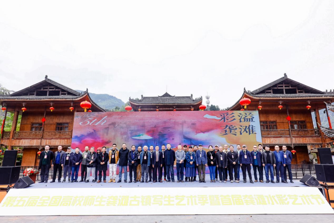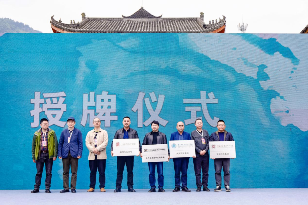 现场还进行了隆重的授牌仪式,上海市浦江画院、四川美术学院中国画与书法艺术学院、重庆工程职业技术学院分别授予龚滩古镇“龚滩写生基地”牌匾;川音成都美术学院授予龚滩古镇“公共艺术教学实践基地”牌匾。随后“彩溢龚滩——第五届全国高校师生龚滩古镇写生艺术季暨首届龚滩水彩艺术节”启动。
