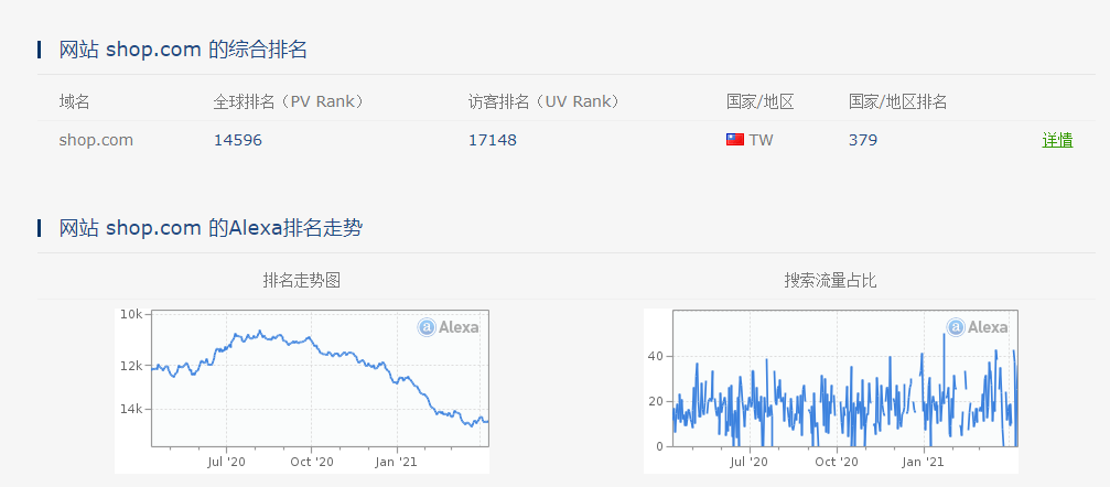 1、 近日,在国外域名论坛上,有用户分享了一则消息:根据Alexa的流量报告显示shop.app的流量比shop.com要更高。小胖也查询验证了,在排名上shop.app是全球6266名,而shop.com则是14596名,相差还很大的。但是,我个人觉得流量排名中域名只是其中一部分影响力,此外还受公司品牌、公司营销等各方面的重要因素影响。