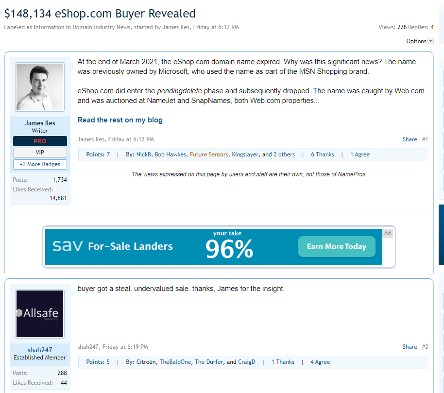 2、据国外圈内人爆料,在2021年3月的时候,eshop.com因为过期而被竞拍,最终以148,134美元交易,当时的买家并没有透露,而在最近该域名再次更新了信息,加利福尼亚州的Alex Nguyen是新的持有人(难道不是再次交易?)。在该大佬的帖子后面,也有用户表示:这个域名被严重低估了价格,可能是被盗了……