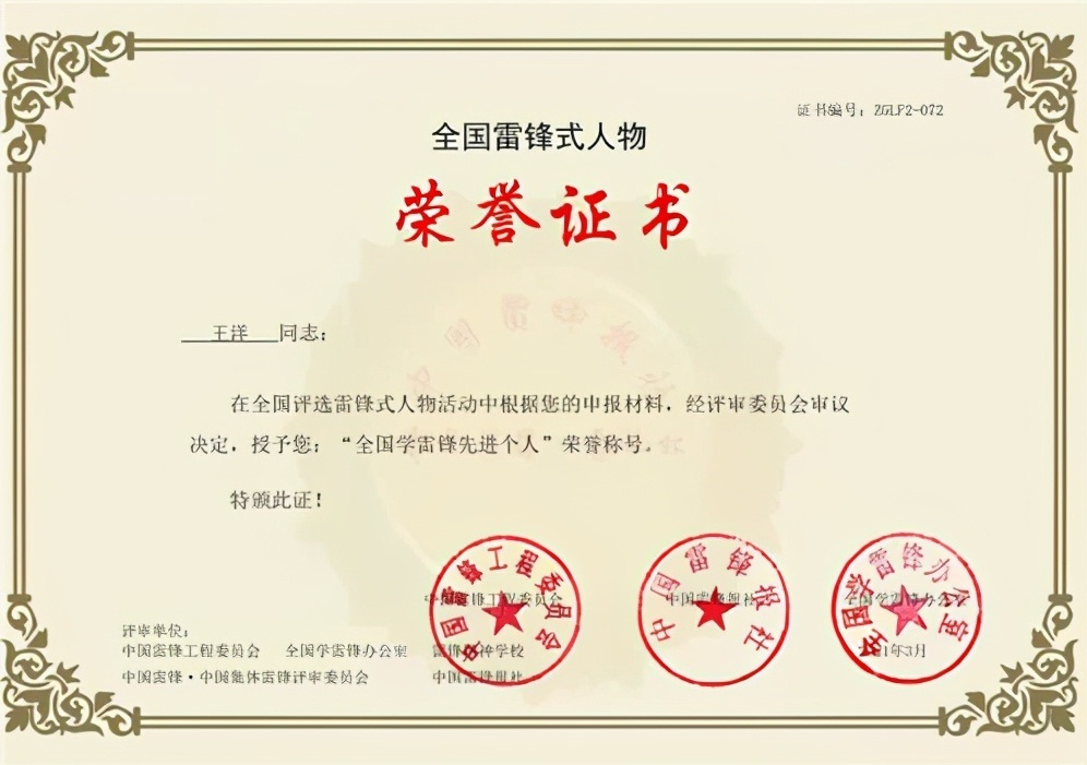 2021年3月由全国学雷锋办公室、中国雷锋报社、中国雷锋工程委员会,在全国评选雷锋式人物活动中,经评委会审议决定,授予王洋同志"全国学雷锋先进个人"荣誉称号,并为其颁发了"青年荣耀勋章"。