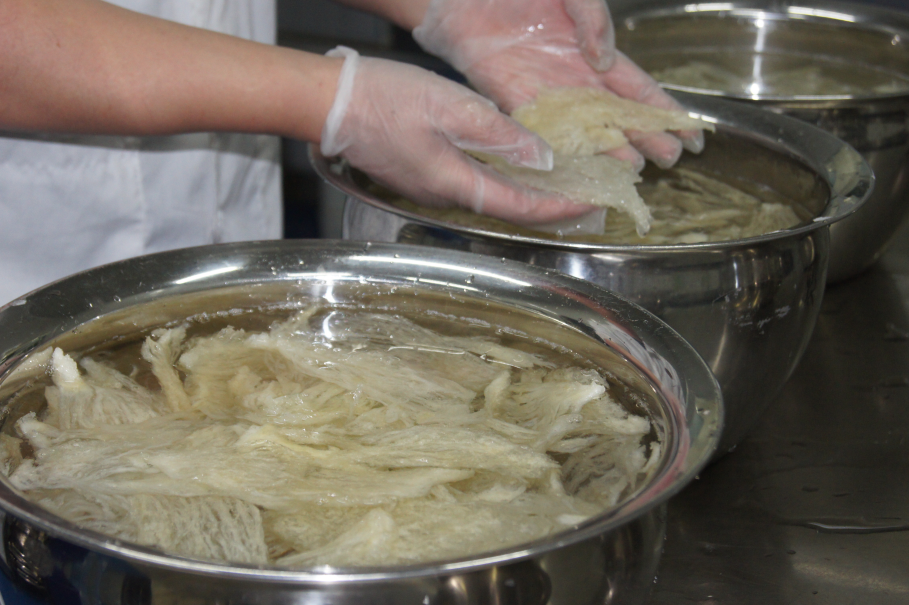 生产开始之前,工人们会进去冷冻库取出干燕窝原料并将其浸泡入3-8°的冷水中进行泡发,在这个过程中,需严格控制好泡发率、温度、时间,只有这样才能锁住燕窝营养确保口感。