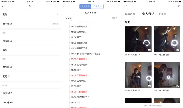 所有的使用门锁的信息都会在第一时间同步到APP当中,当然它这智能锁是不能放置内存卡的,这样直接传到APP上方便我们直接保存图片。个人对于用户管理还是感觉比较喜欢的,用了6款智能锁,没有一款像这样能够把每个人的指纹、密码及NFC解锁放在一起修改的,方便管理员直接管理。而且还可以设置一次性密码,方便新装修的用户来使用。