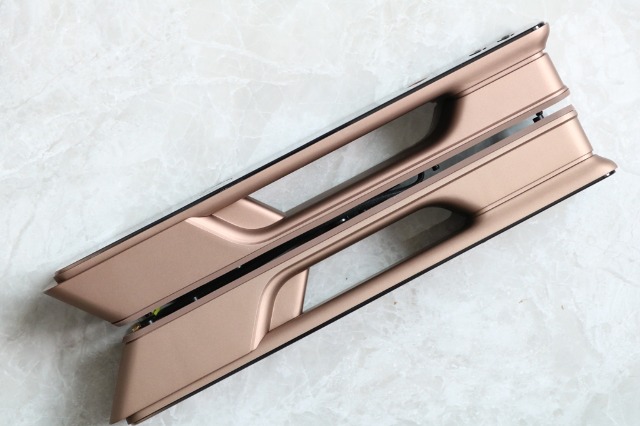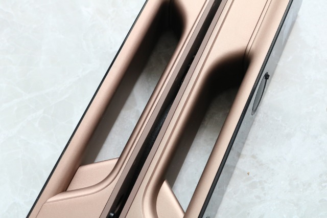 从前后面板侧面看,咖啡金色磨砂侧面加上门把手设计,有些许的霸气,像是魔杖。它的内侧都有硅胶垫,方便与门锁的找平及门锁与门连接的过度。