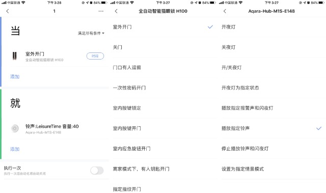 咱们就简单的模拟一下Aqara全自动智能猫眼锁H100的全屋互联的操作,通过智能锁与网关小夜灯的执行操作,我选择了当开锁时会响铃这种操作。当然家中同类智能产品多的话还可以进行多种操作,比如当门前有人逗留时,自动监测开始后,通过互联可以设置播放驱赶的铃声等操作。