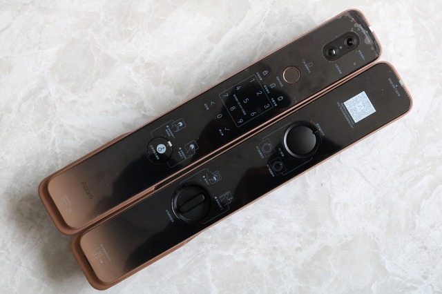 Aqara全自动智能猫眼锁H100外观采用了咖啡金渐变色的设计,尽显高端门锁,比较适合现代风格的家中使用,安装完之后你会发现从楼道内看你家瞬间上升了一个档次。咖啡金渐变色的亮面处理呢比较容易留下汗液,需要经常保养。