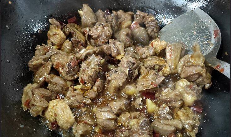 2、起锅,锅中倒入适量食用油,油热后下入切好的鸡肉,开大火不断翻炒,将鸡肉表面的水分炒干,炒出鸡肉表面多余的油脂,待鸡肉炒至微微发黄后下入切好的蒜粒、姜粒以及提前准备好的八角、桂皮、香叶、干辣椒段、花椒、不断翻炒出香味,随后下入一勺郫县豆瓣酱和一块火锅底料,转小火不断翻炒出红油;
