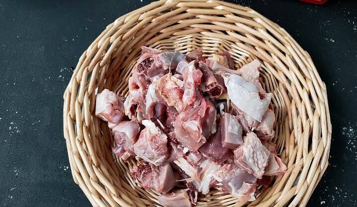 1、准备半只鸡,处理干净后剁成小块,全部剁好后装入盆中,倒入适量清水浸泡20分钟,将鸡肉中的血水充分浸泡出来,20分钟后将鸡肉捞出,挤干水分,装入盘中备用;大蒜去掉外皮切成小粒,生姜也切成小粒,干辣椒切成小段,小葱切成小段,芋头去掉外皮后清洗干净,切成比鸡肉稍大一些的小块,放置一旁备用;