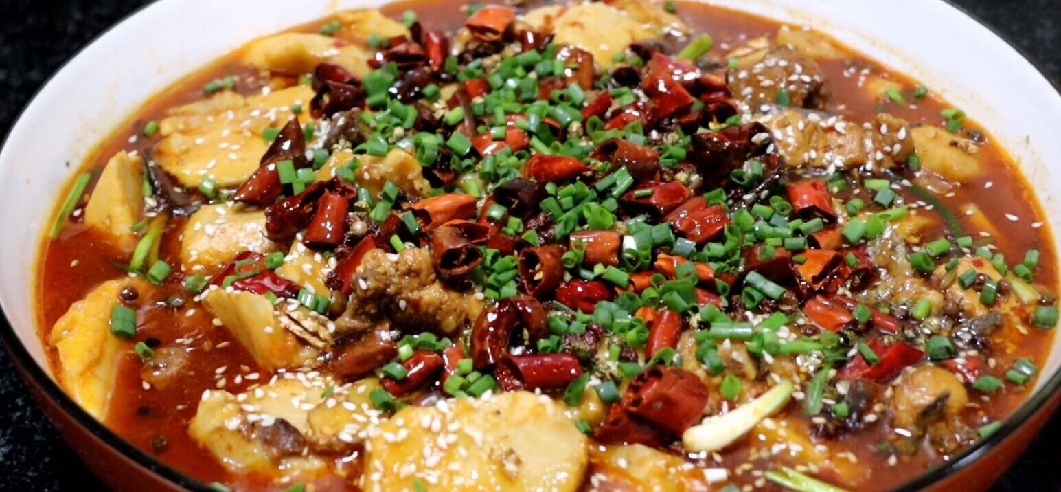 4、再起起锅,倒入适量食用油,油热后下入一小撮花椒和干辣椒段,开小火不断翻炒爆出香味,随后盛出淋在食材上,激发出葱花和白芝麻的香味,这道非常美味的芋儿鸡就做好了,鸡肉麻辣鲜香,鱼头软糯入味,特别好吃。