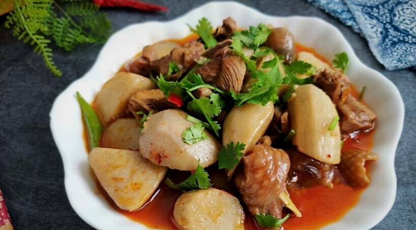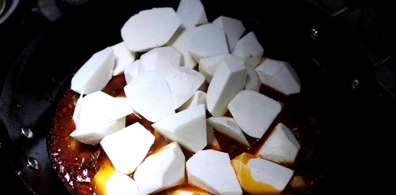 3、炒出红油后倒入适量清水,清水的量刚好没过鸡肉就可以了,再倒入切好的芋头,开大火煮开后开始调味,加入盐、胡椒粉、鸡精、白糖,快速翻拌均匀,然后盖上锅盖转小火焖煮30分钟;30分钟后打开锅盖,加入切好的葱段,翻拌均匀后盛出装入大碗中,撒上一些熟白芝麻和葱花备用;