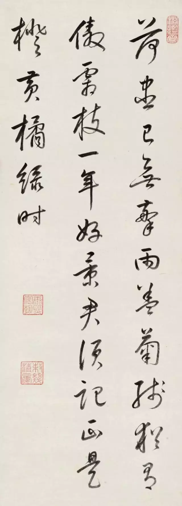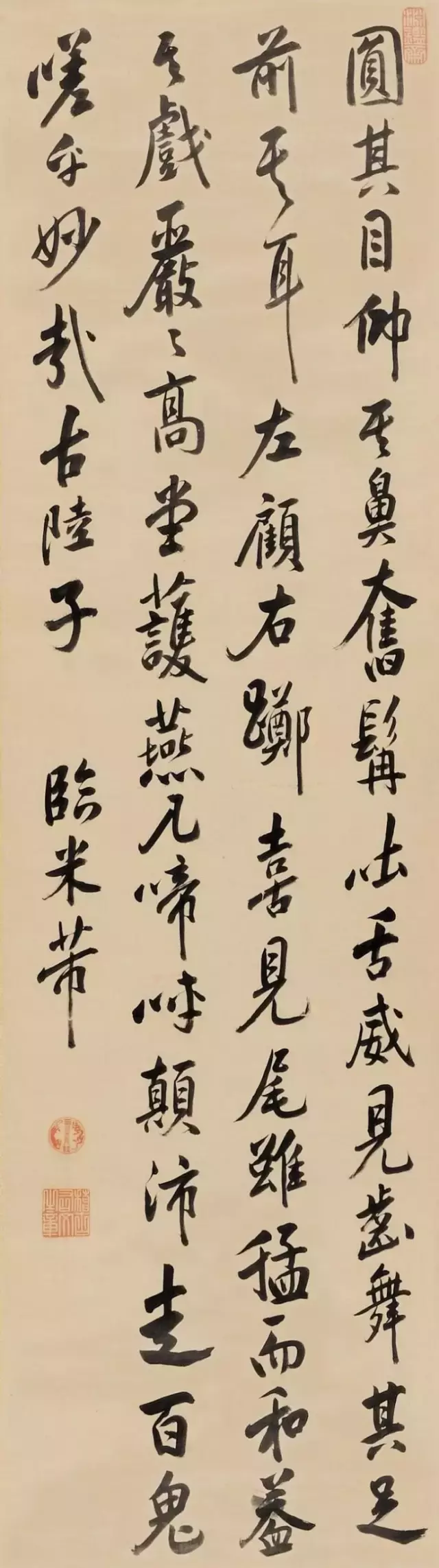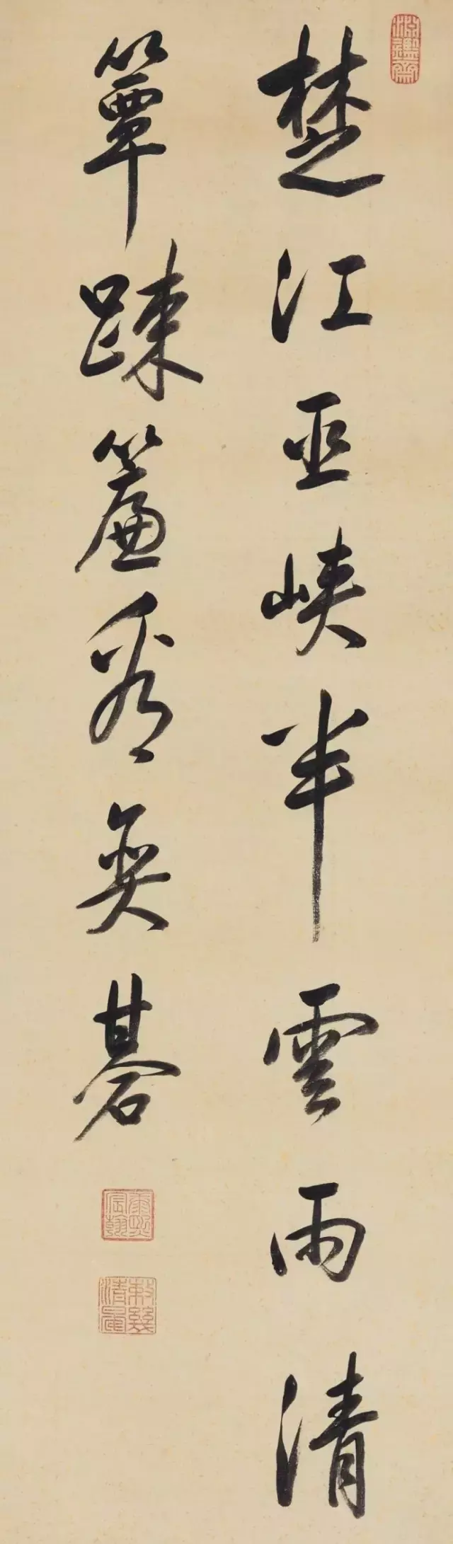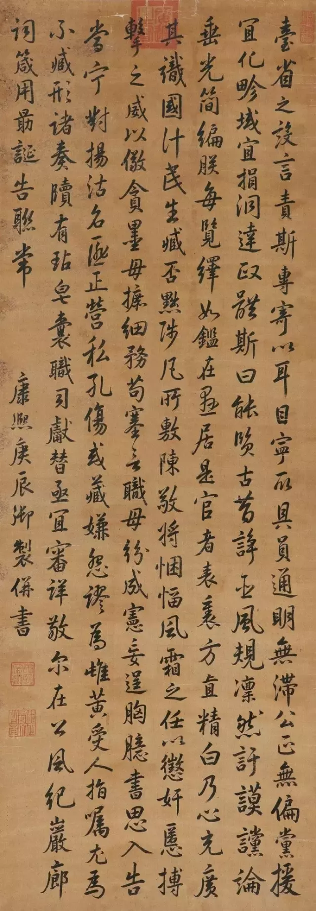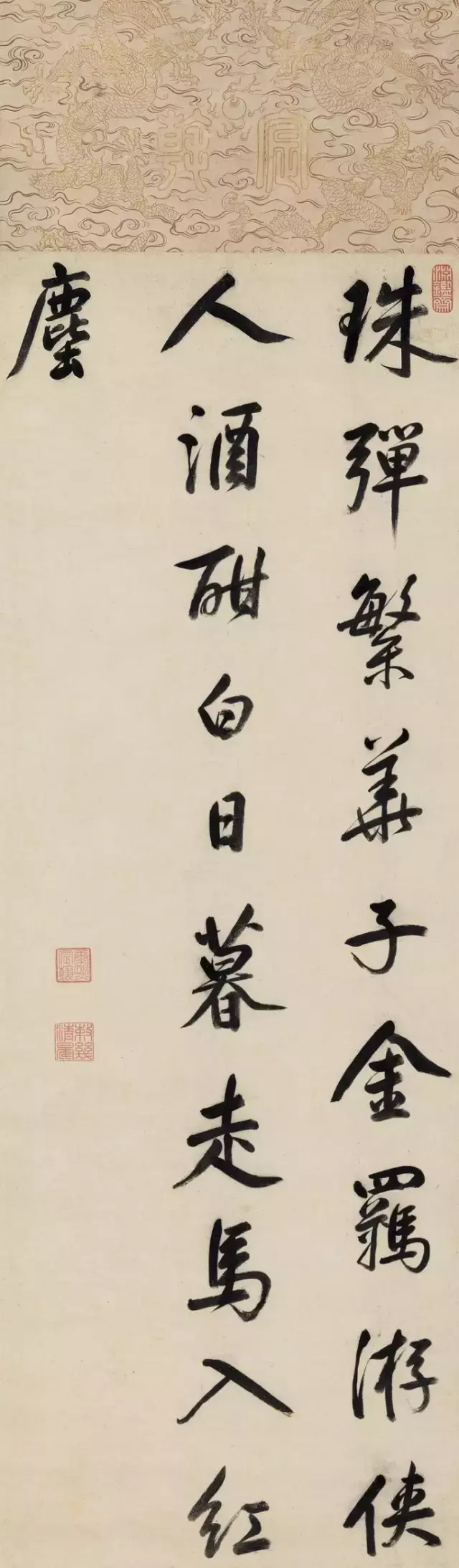 康熙皇帝是清代帝王中最有作为的一个,不仅奠定了大清基业,更开创了康雍乾三代盛世,他勤政好学,万机之暇常以书法抒怀。笔法似董其昌,得其俊雅而厚重圆润,气度从容而自信,应该说,在清代诸帝中,书法亦应当推他为第一,也有评论家说雍正第一,这里就不做讨论了。