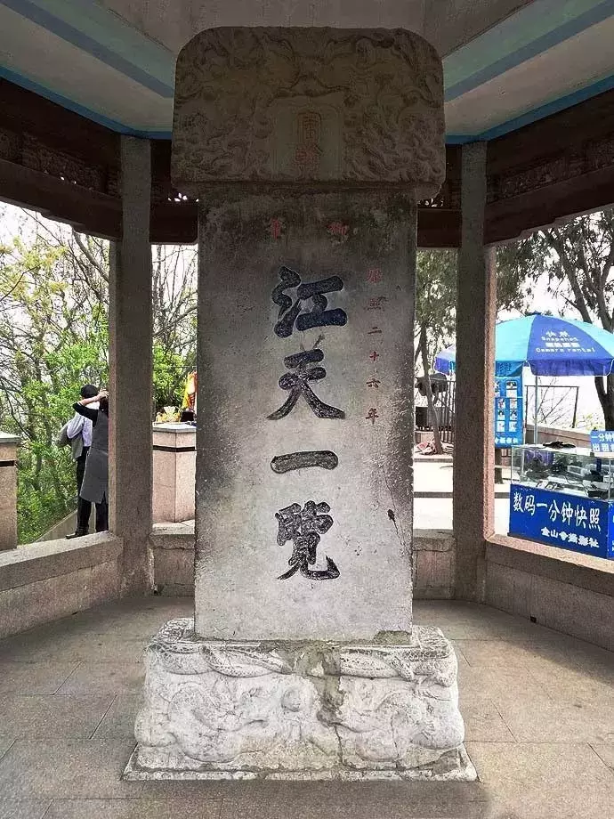据说当年,康熙皇帝登临金山登顶峰,及目处,大江水天相连,气势雄伟,便即兴提起御笔,要留下“江天一览”四个字,但提笔忘字,竟一时想不起,览字怎么写,正当康熙御笔难收之时,一随行大臣急中生智,出班高声道:“臣今见驾”。康熙听罢恍然,这不就是览字吗?遂落笔将览字写出。这就是今凌云亭内御碑上“江天一览”四个字的来历。