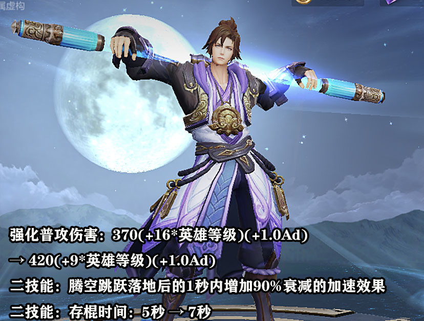 孙悟空在体验服的更新中被大幅增强,强化普通攻击的基础伤害大幅提升。孙悟空使用二技能位移落地之后,自身会获得额外90%递减的移速加成。每次技能使用之后的存棍时间也增加了两秒,使得连敲4棍这样的操作也变得尤为简单。