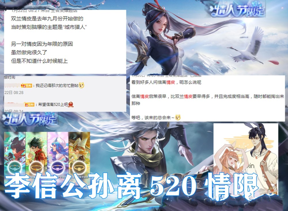 五五开黑节过后,另外一个重大的节日便是520情人节。这是一年中第2次情人节,不出意外的话,王者荣耀将会出一套情侣限定皮肤。最近在王者荣耀各大论坛中都在爆料,关于李信和公孙离的情人节限定皮肤。并且网上还有关于这套情侣皮肤的原画,可以看出关于这个爆料的消息还是比较真实的。