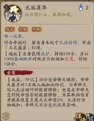 金莲:【减益,印记】回合受帝释天操控,帝释天最多对1名敌人施加此印记。当帝释天陷入无法动作时提前移除;金莲在帝释天受到致命伤害时提前移除,为其抵挡伤害并使其恢复至最大生命值5%。无法对怪物施加;帝释天不会受此效果影响。