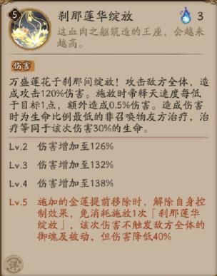阴阳师SSR帝释天三技能:刹那莲华,万盛莲花于刹那间绽放!攻击敌方全体,造成攻击120%伤害。施放时帝释天速度每低于目标1点,额外造成0.5%伤害。造成伤害时为生命比例最低的非召唤物友方治疗,治疗等同于该次伤害30%的生命。